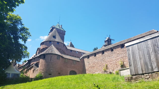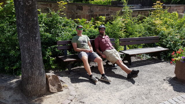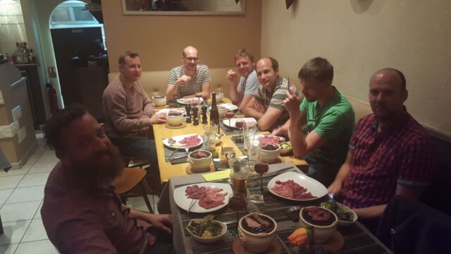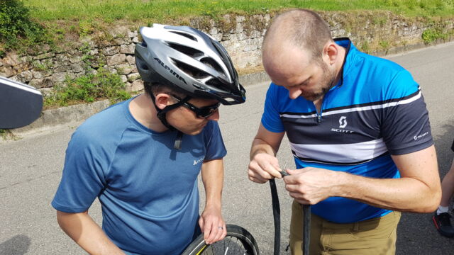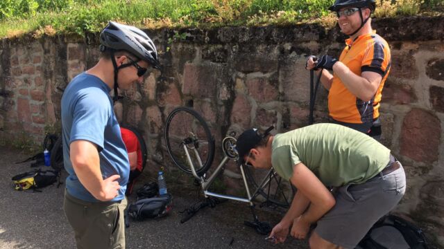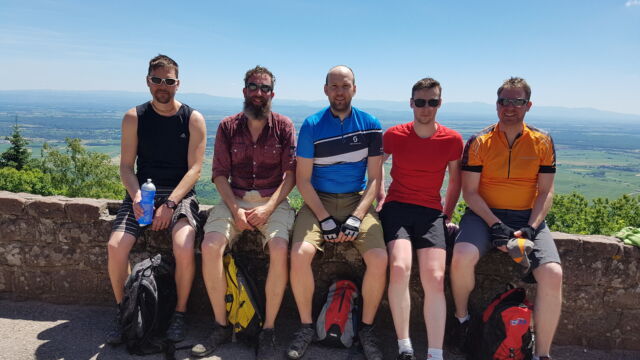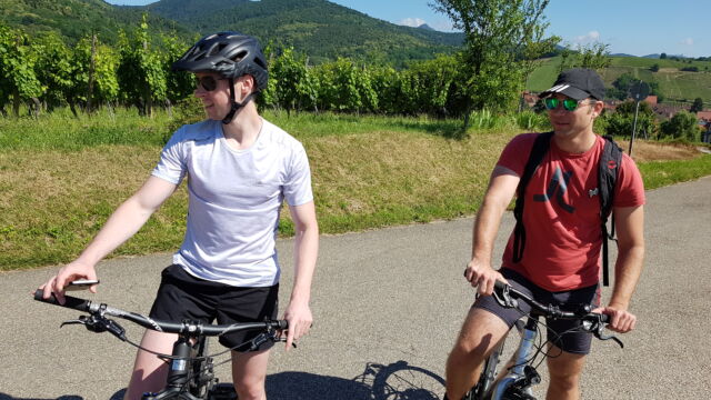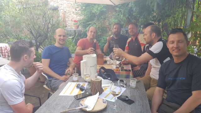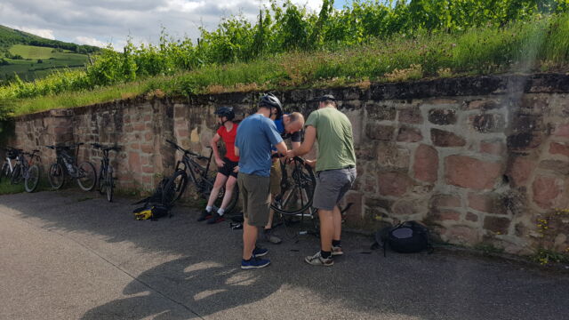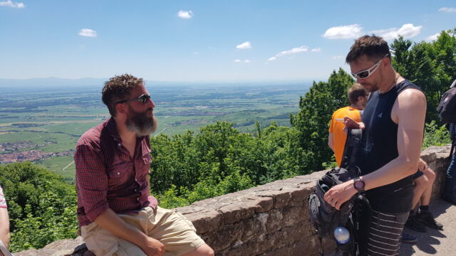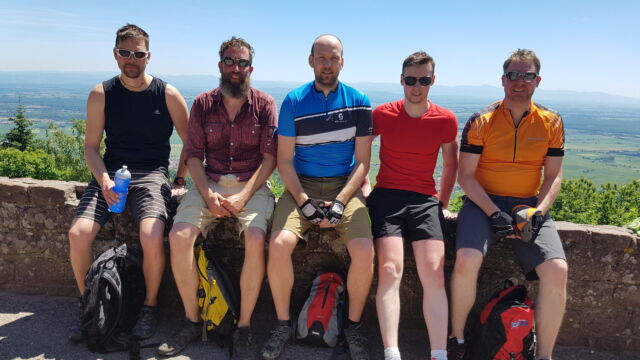 Dani, Felix und Patrick waren von der Velotour am Samstag dermassen erschöpft, dass sie am Sonntag – kaum losgefahren – absichtlich Velopannen simulierten und den sportlichen Rest der Truppe verliessen. Endlich konnten wir Gas geben – wir mussten nicht mehr auf das lästige E-Bike warten – und besuchten diverse Gipfel und Schlösser. Nach gefühlten 8’000 Höhenmetern waren die meisten Tanks leer. Doch Cola und ein Gipfel-Bier belebten uns wieder und wir schossen mit einer rassigen Fahrt ins Tal hinunter. René wollte zum Ende unbedingt nochmals «Weinberg hoch und runter» spielen, sodass wir erschöpft, aber zufrieden wieder in Riquewihr ankamen.