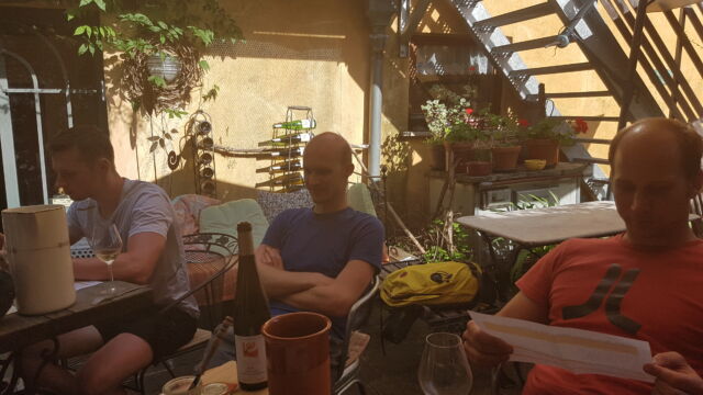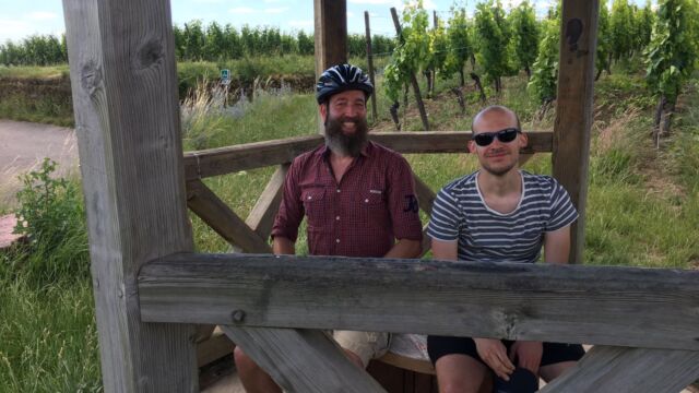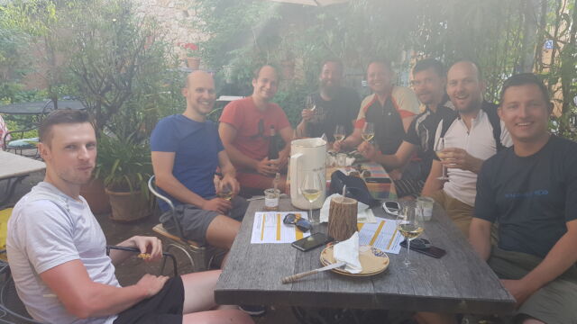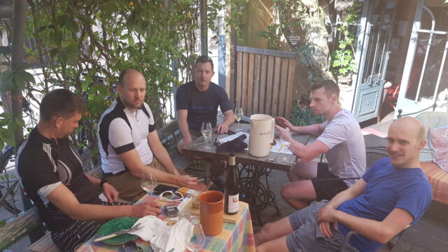 Am nächsten Morgen hüpften wir noch beschwingt auf unsere Velos und fuhren die Weinberge hoch und runter, hoch und runter… was irgendwie etwas mit unserem einzigen E-Bike-Fahrer zusammenhing, der den Weg vorgab. Nachdem Dani erfolgreich von der Spitze verdrängt wurde, konnten wir endlich unser erstes Bier tanken. Wir wiederholten das Spiel mit den Weinbergen und dem Alkohol noch einige Male bis wir um 17 Uhr (!) endlich Wein degustierten und langsam in Stimmung kamen. Das erschwerte zwar eher unsere Heimfahrt, machte sie aber ausgesprochen unterhaltsam.
